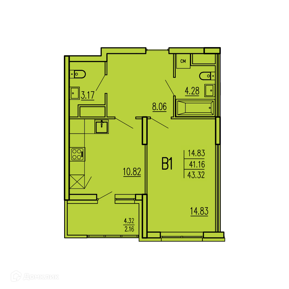• Площадь - 43.32 м²